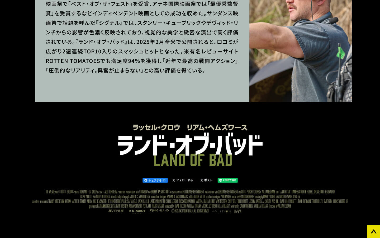This is the official website for the military action film “Land of Bad” starring Russell Crowe and Liam Hemsworth. The site features a robust tactical design that reflects the film’s high-intensity military theme through strategic use of military-inspired typography and color schemes. The layout incorporates dynamic visual elements including weapon specifications, military unit descriptions, and technical details that immerse users in the authentic military experience. The responsive design ensures optimal viewing across all devices while maintaining the film’s gritty, realistic aesthetic. Interactive elements include smooth transitions, hover effects on military equipment imagery, and carefully crafted loading animations that enhance user engagement. The site architecture features detailed character profiles, behind-the-scenes content, and technical specifications of military hardware, all optimized for both performance and accessibility. The color palette utilizes military greens, tactical blacks, and metallic accents that create an authentic battlefield atmosphere while maintaining modern web design standards.